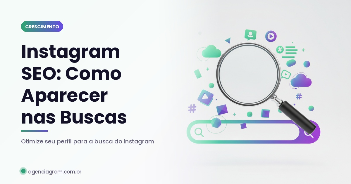 É o conjunto de práticas que otimizam perfil e conteúdo para aparecer nas buscas do Instagram e do Google. Envolve palavras-chave no nome, bio, legendas, alt text e áudio dos Reels.